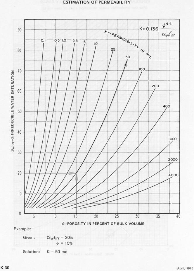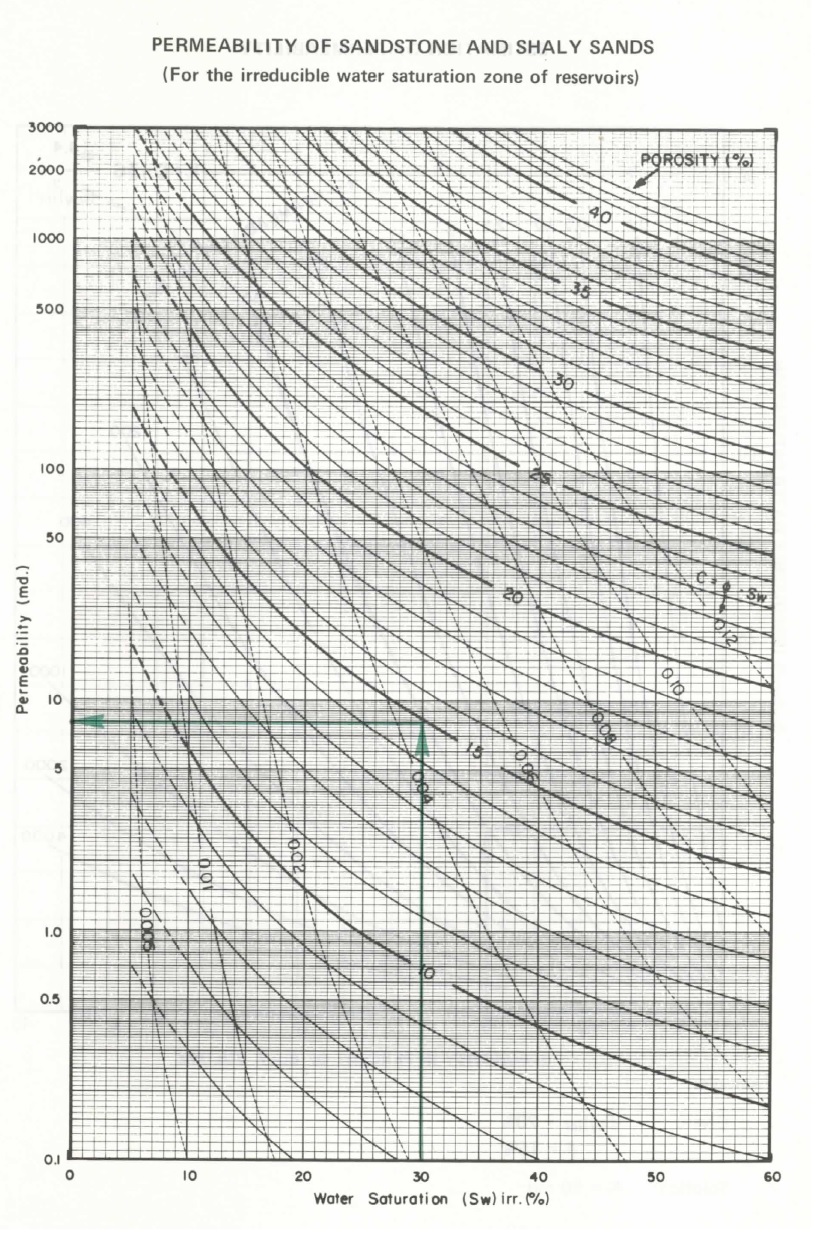 A chart constructed from an empirical relationship published by Wyllie and Rose in 1950, provides reasonably accurate estimates of permeability in the irreducible water saturation zone of sandstones and shaly sands, and is based upon the general equation:
