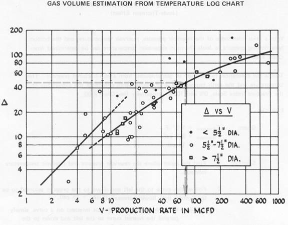 Gas volume estimation from the temperature log chart is a plot of delta, D , versus Gas production Rate, V, for different hole sizes.