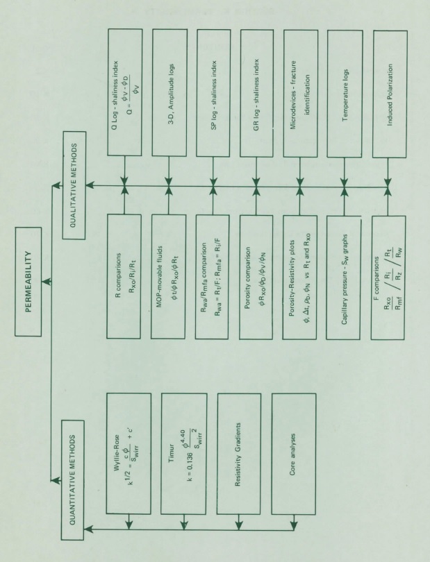 There are numerous approaches to the measurement of permeability in formations utilizing geophysical well log data, but only a few are quantitative. The methods utilize potential, resistivity, porosity, formation factor, fluid saturation, and acoustic data derived from various logs and may be classified as follows: