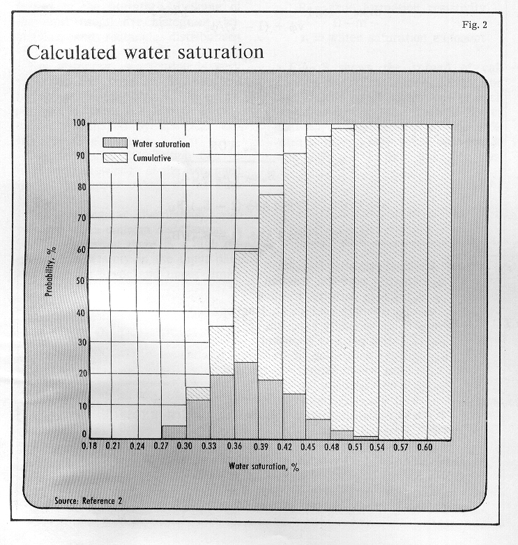 Calculated water saturation spread and probability of occurrence for each water saturation is shown in this figure. The figure indicates that Sw ranges between 27 and 54 percent with the most likely value between 36 percent and 39 percent. It further indicates there is a 90 percent chance of having a water saturation of 45 percent or less. The zone under evaluation was perforated and produced water-free oil. (Ref. 2)