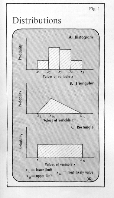 The problem of uncertainty is even more pronounced in the evaluation of a naturally fractured reservoir. There are many qualitative and quantitative techniques which are used with varied degrees of success. (from Reference 7, 8) For this example, histogram, triangular, and rectangle distributions of the input data are used. (TABLE 2) Equations 4 thru 10. (from Reference 3)